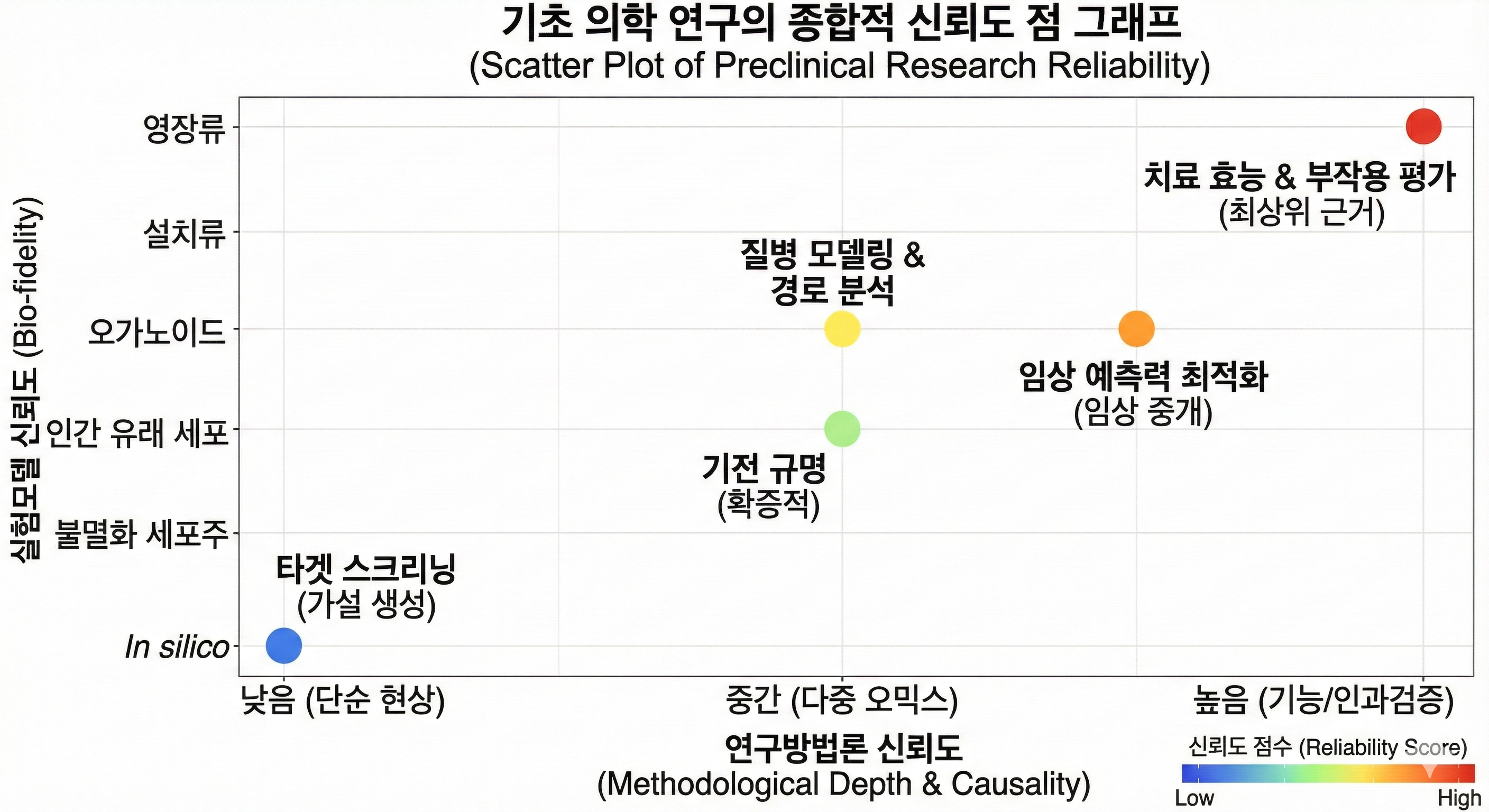 연구모델에 따른 신뢰 수준 뿐만 아니라 분석 방법에도 신뢰 수준이 있습니다. 예를 들어 단순히 특정 단백질의 발현(Western Blot)을 보는 것을 넘어, Bulk/Single-cell RNA sequencing이나 Proteomics를 결합하여 유전체라는 생명 현상의 본질에 다가갈 때 연구의 신뢰도는 비약적으로 상승합니다. 이는 나무 한 그루의 변화가 아닌 숲 전체의 인과관계 사슬(Causal Chain)을 완결하려는 기초 과학의 현대적 문법입니다. 아래 그래프는 연구모델과 분석방법에 따른 신뢰 수준을 모식적으로 표현해본 그래프입니다. 수 많은 연구들을 이렇게 단순화 시킬 수 있을지에 대해 많은 의문이 제시될 수 있겠지만, 그럼에도 논의의 시작을 위해 개념도를 만들었습니다.